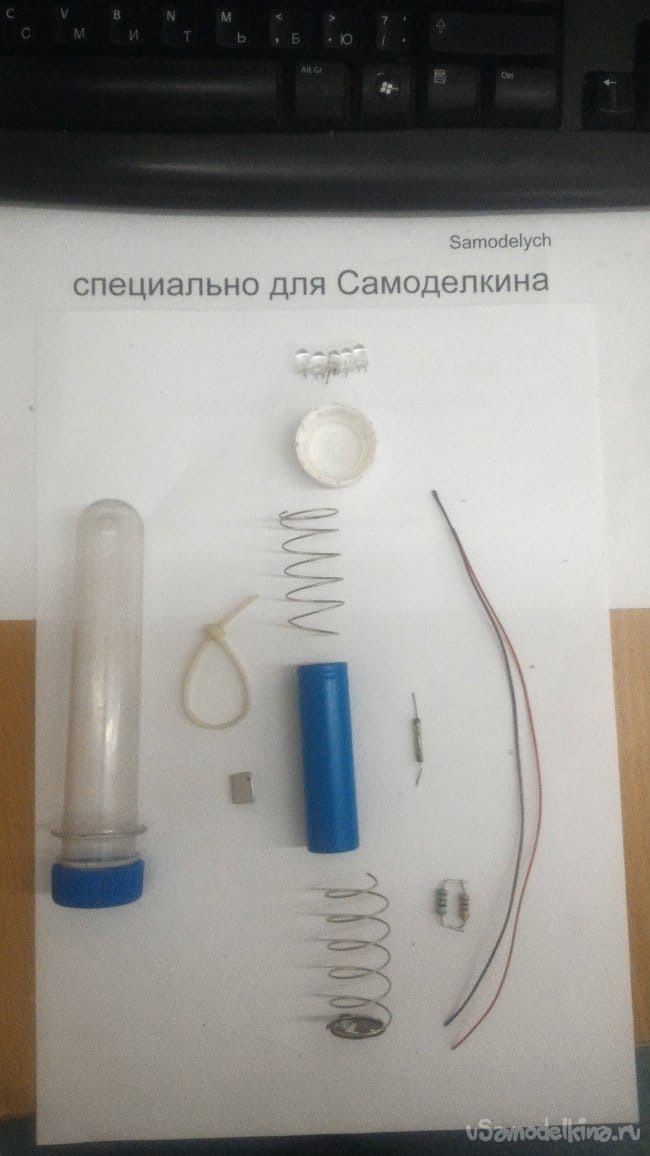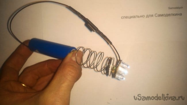 После того, как клей застыл, последовательно вставляем всю конструкцию в корпус. Первыми идут светодиоды. Затем, батарея, плюсом вперёд (то есть, к диодам). Потом вторая пружина.