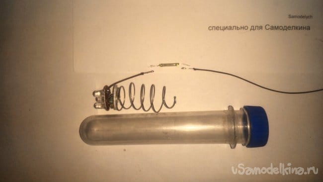 Идущий, теперь уже от геркона, провод, согласно схеме, припаиваем ко второй пружине, подготовленной по тому же принципу, что и первая.