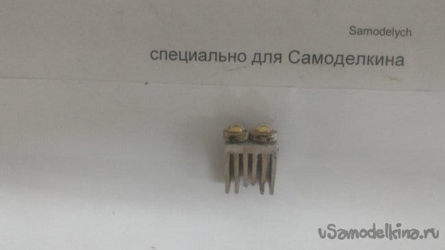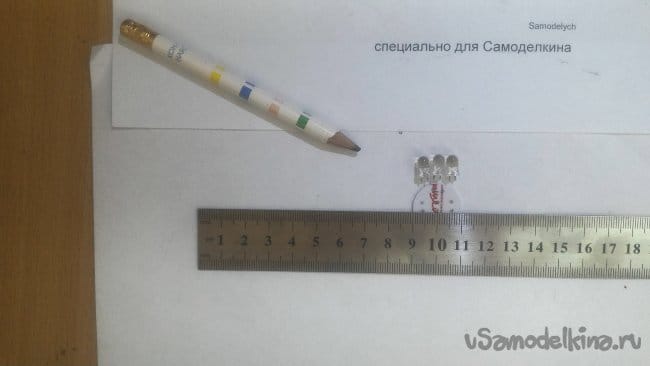 После чего размечаем отверстия под ножки светодиодов с таким расчетом, чтобы расстояние между контактами составляло 3мм, а между центрами диодов 5-6мм, и они не выступали бы за пределы вырезанного нами кружка.