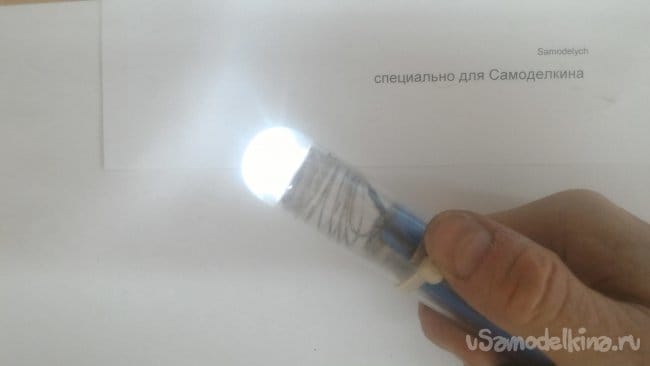 После того как мы убедились, что диоды горят, разрезаем идущий к минусам провод с таким расчетом, чтобы разрыв пришелся примерно на середину корпуса будущего фонарика. Именно в этом месте будет удобнее всего управлять включением и выключением фонаря держа его при этом одной рукой.