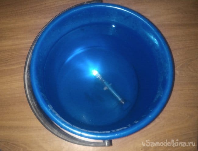 Ну, и, конечно, «полевые» испытания - проверка водой. Включаем и бросаем на дно импровизированного водоема.