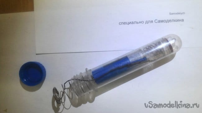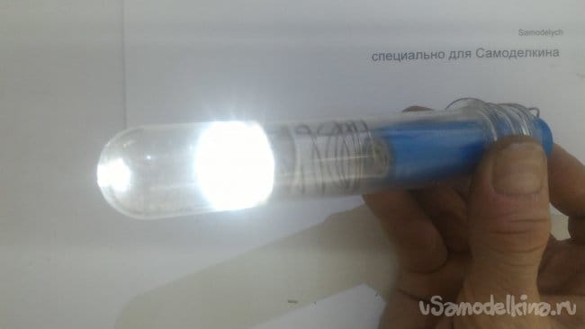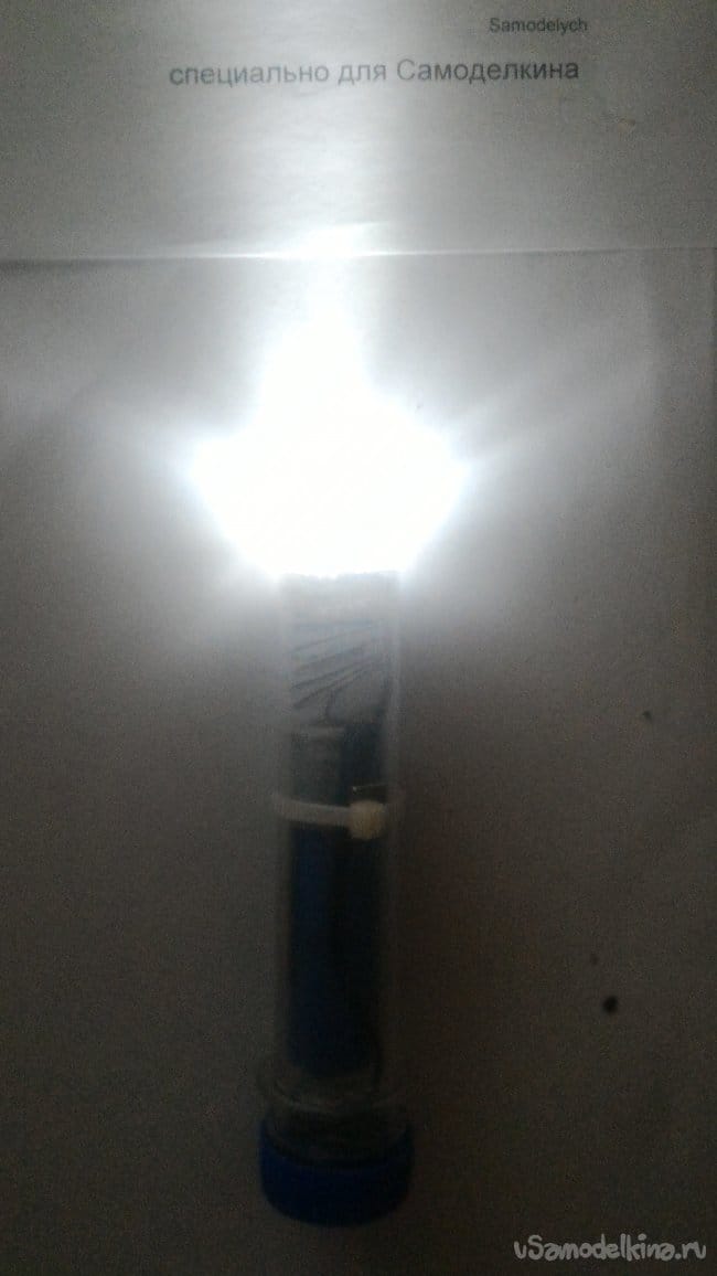 Теперь, удерживая фонарь всего одной рукой и вращая большим пальцем стяжку вокруг корпуса ПЭТ преформы, можно легко и непринужденно включать и выключать наш фонарь даже под водой, и при этом не опасаться, что внутрь попадет влага.