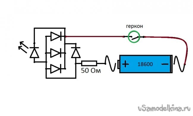 Затем, к минусовым контактам диодов подпаиваем еще один провод, который через геркон замкнет цепь на минус батареи.