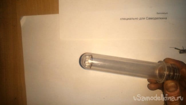 Пока мне на глаза не попалась заготовка для изготовления ПЭТ бутылок. В такие иногда «упаковывают» всякие игрушки вроде детских часиков. И я сразу понял, что это идеальный корпус для подводного фонаря. Стенки толстые, торец прозрачный, и закручивается герметично.