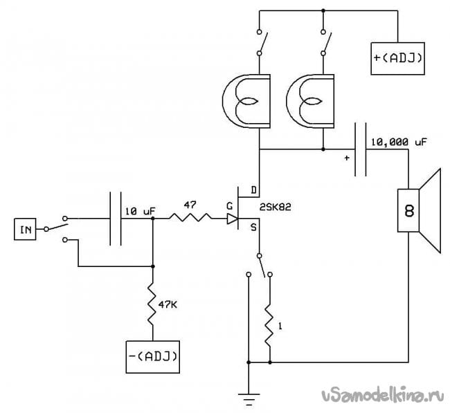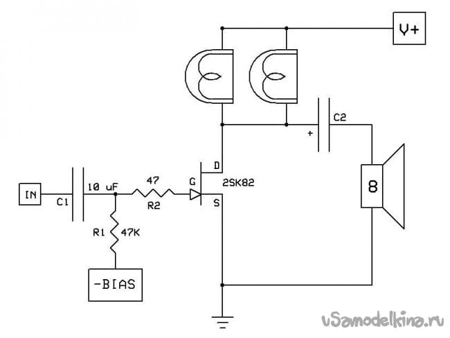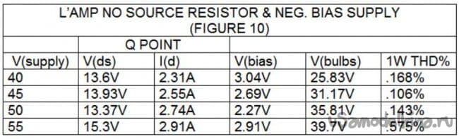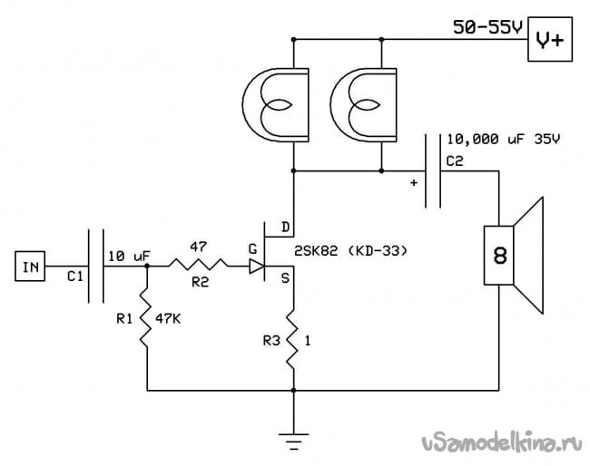 И немного выдержек из дальнейшего текста: «я попробовал одну, две и три лампочки, и результаты были не очень интересными… эту область можно было бы использовать с другой нагрузкой… Коэффициент усиления этой схемы - это эффективная нагрузка, деленная на обратную крутизну полевого транзистора. Возвращаясь к нашей характеристической кривой, мы видим, что крутизна в рабочей области составляет около 0,4 А на входное напряжение, или 0,4 Сименса. Эффективная нагрузка - это сопротивление нашей лампочки, подключенной параллельно нашему динамику на 8 Ом, или около 5 Ом. Это не так много усиления, но характеристики искажения выглядят довольно неплохо… (Схема на) рисунок 11 не требует какой-либо регулировки или отдельного источника смещения, и он поможет вам довольно близко. ©» Итак, конечная схема.