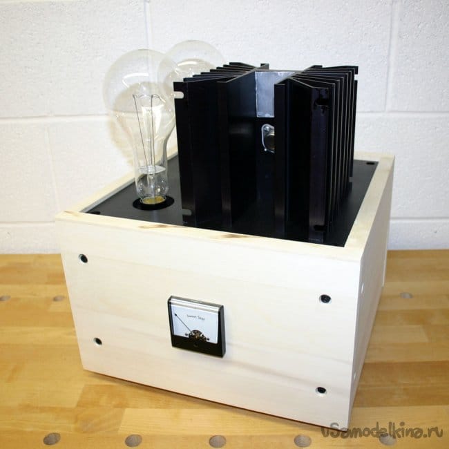 Почему-то автор назвал ее «моя тестовая установка «брось науку в стену и посмотри, что прилипнет». ©». В процессе работы схема слегка меняется, см. следующий рисунок. «…Входное сопротивление равно значению R1, а выходное сопротивление примерно равно общему сопротивлению лампочек. Я использовал две лампочки мощностью 300 Вт (американские бытовые сети 120 В 60 Гц), параллельное сопротивление которых находится в диапазоне 11-13 Ом…©»