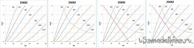 Далее автор моделирует рабочую схему, при этом в качестве стоковой нагрузки транзистора использует лампы накаливания в режиме, близком к режиму бареттера, т.е. генератора тока, пробует разные режимы и останавливается на таком: «2SK82 рассчитан на 95 Вт, и в идеале мы могли бы захотеть увидеть запас прочности 4: 1, чтобы гарантировать, что наши детали прослужат долго… увеличим мощность до 45 Вт или около того… для каждого значения Vgs нарисуем точку, в которой рассеиваемая мощность равна 45 Вт, и соединим их кривой, как на рисунке…©» И т.д. Результаты на графиках.