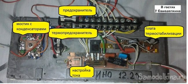 Ставим конденсаторы на мостик. Транзистор и терморезистор через слюду, стабилизатор 7812 и термопредохранитель прямо на радиатор.