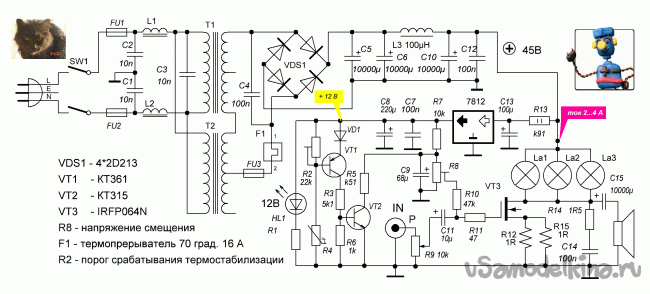 Слабое место здесь - максимальное допустимое напряжение между стоком и истоком, всего 55 В, поэтому ограничим напряжение питания до 45…50 В. Рисуем полную схему.