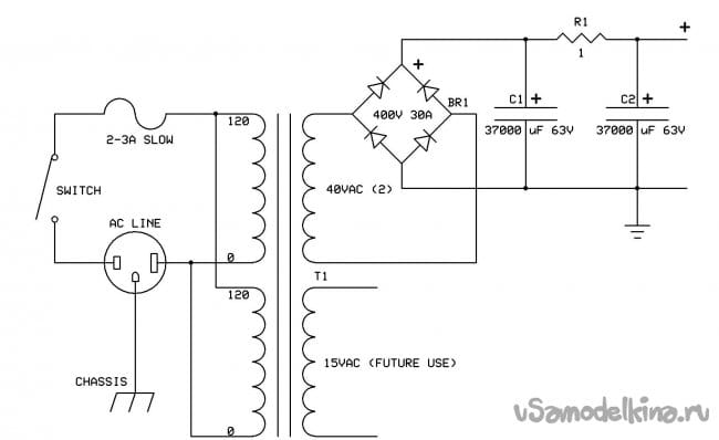 Далее «схема блока питания для одного канала, и здесь нет ничего необычного. Я использовал трансформаторы на 400 ВА от Antek, у которых есть две вторичные обмотки на 40 В, которые подключены параллельно. Anteks также имеет две вторичные цепи на 15 В, что удобно для добавления небольшого регулируемого источника питания…©».