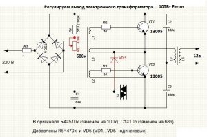 Они заточены для работы одновременно с двумя лампами и самодельный трансформатор не может обеспечить необходимую нагрузку для уверенно запуска автогенератора. Необходимо в цепи запуска динистора D14 параллельно диоду D13 припаять резистор 470 кОм. На схеме выделено красным