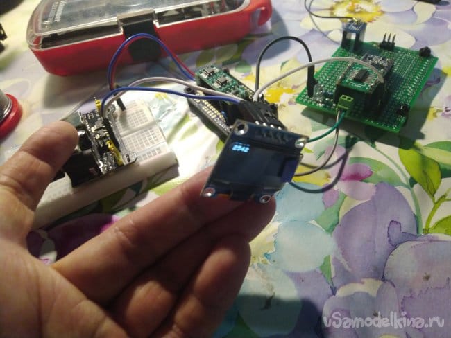 Работа с Attiny, вообще говоря, представляет определенную сложность, так как данная серия микроконтроллеров не обладает полноценным SPI и не имеет на борту hardware serial. Это влечет за собой невозможность простой отладки кода через последовательный порт. Существует большое количество библиотек-реализаций software serial, но ни одна из них у меня так и не заработала на Attiny84. Таким образом, было решено проводить отладку влоб - с помощью OLED-экрана ssd1306. С подключением этого распространенного экрана к Attiny84 также существуют определенные сложности, но опытным путем были найдены библиотеки, позволяющие все-таки выводить на этот экран данные с Attiny84 [13][14].