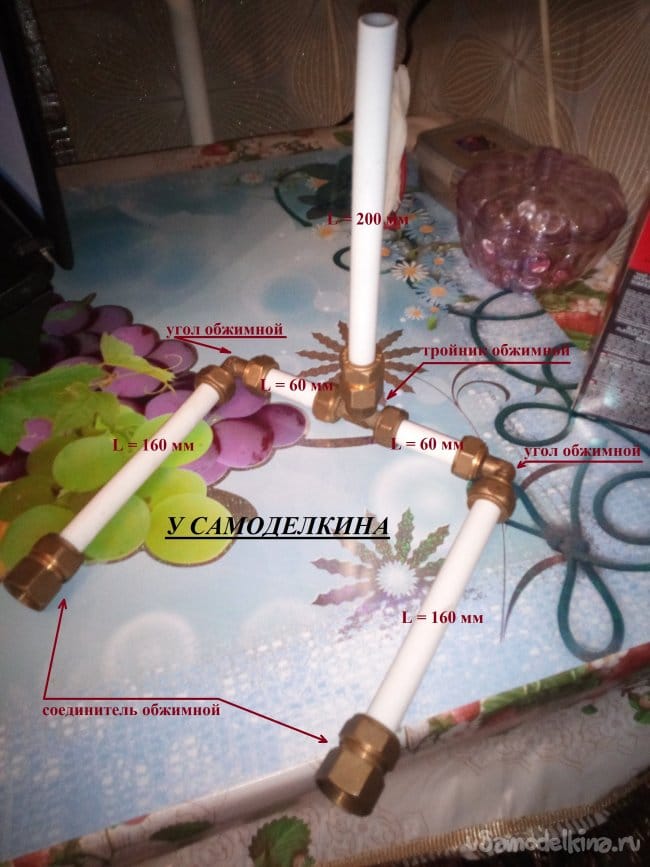 Подготовил куски металлопластиковой трубы D16 мм: длиной 200 мм = 4 шт., длиной 160 мм = 2 шт., длиной 60 мм = 2 шт. Также понадобиться фитинги все на D16 мм: