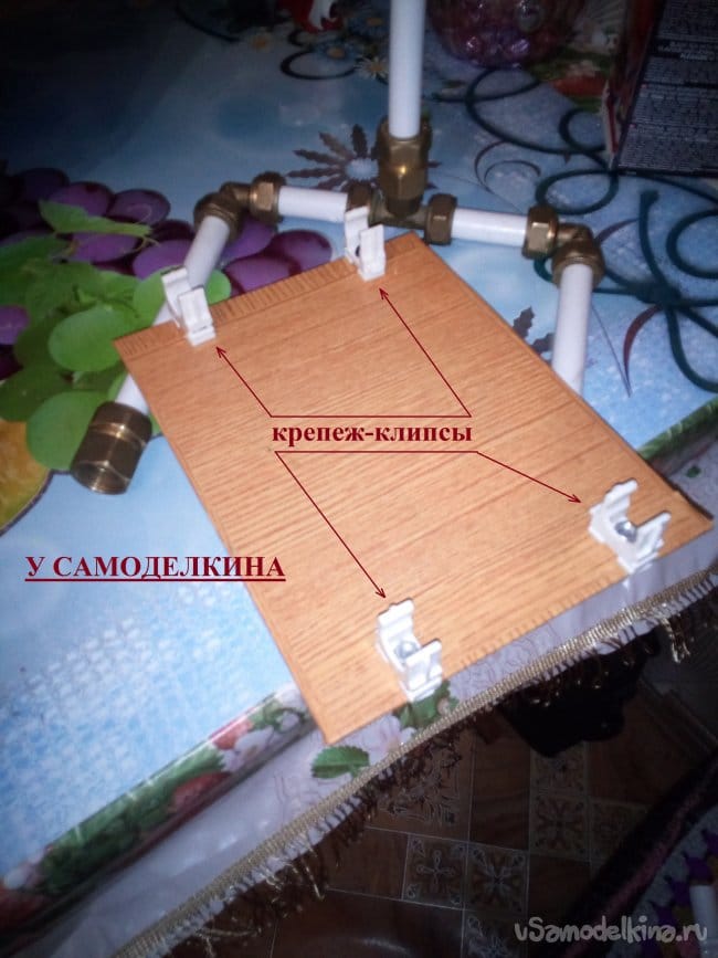 Далее в столешнице делаем 4 отверстия и прикручиваем болтами к ней крепеж-клипсы и крепим к «скелету»: