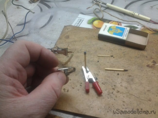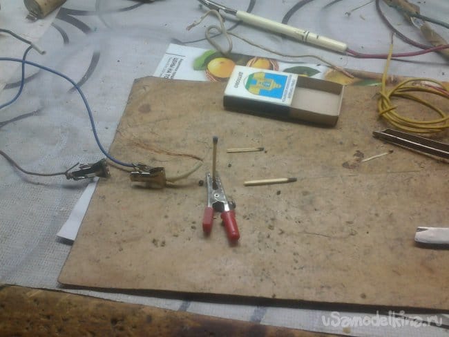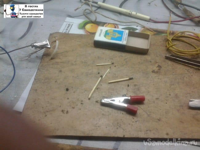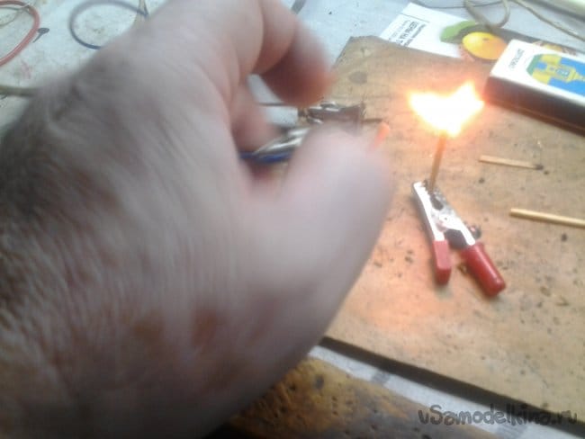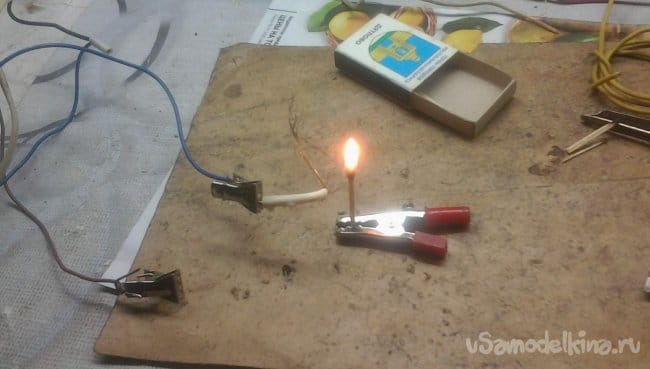 Наматываем 2 витка провода (чтобы держался) на головку спички, включаем. Ничего не происходит, ничего, вдруг вспышка, я не успел сфотографировать и не заметил, когда порвался провод.
