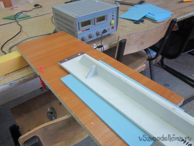 Поскольку стояла задача изготовить максимально легкие конструкции применяли изощренные технологии. Одна из них резка пластин для крыла заключается в следующем. На стапеле натягивается нихромовая струна под углом. С одной стороны её высота над столиком 3мм с другой 0 мм. Резал много пластин треугольных. Понятное дело тестовые резы и брака было тоже нормально так.