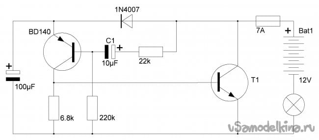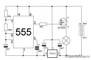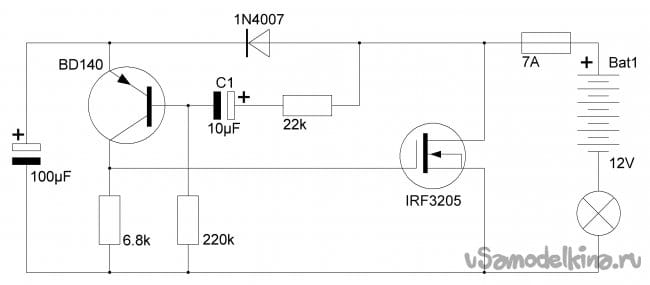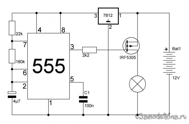 Следующая схема построена только на транзисторах но работает ничем не хуже первой схемы. Можете заметить, что она подключается последовательно с нагрузкой. Давайте рассмотрим принцип работы схемы. Через резистор на 22К заряжается конденсатор С1, когда он зарядиться до напряжения выше отпирания транзистора BD140 он откроется и на затворе полевика IRF3205 появится напряжение и он откроется и пропустит через себя нагрузку. Но за это время конденсатор С1 разрядиться и BD140 закроется и собственно на затворе полевика не будет напряжения и он закрыт, лампочка не светится и так всё повторяется циклами. Мигание лампочки тоже можно изменить в большую или меньшую сторону. Чем больше номинал конденсатора С1 тем реже будет мигать лампочка. Чем меньше номинал конденсатора С1 тем чаще будет мигать лампочка. Транзистор тоже будет полностью холодный. Но при желании можете все ровно прикрутить радиатор.