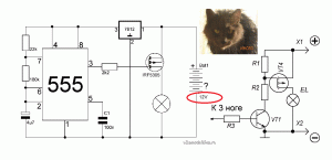 Первая схема построена на таймере NE555. Данная микросхема очень популярна и найти её или купить не сложно. Микросхема генерирует сигнал с заданной частотой, но у микросхемы на выходе очень маленький ток, поэтому его надо усилить. Тут у нас как раз и будет стоять полевой Р-канальный транзистор IRF5305, ток стока у него доходит до 31А но это оригинальный транзистор такой ток выдаёт, а китайская подделка выдаёт примерно 10А. Схема не сложная и её можно спаять на макетной плате это самый дешёвый и надёжный способ.