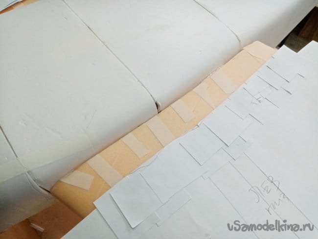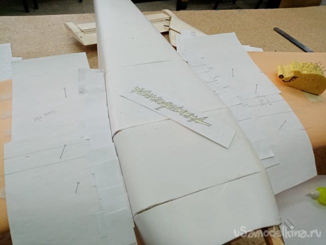 Фиксирую полоски бумаги иголками недалеко от линии стыковки фюзеляжа и крыла. Отмечаю прямо на крыле и бумаге контрольные точки.