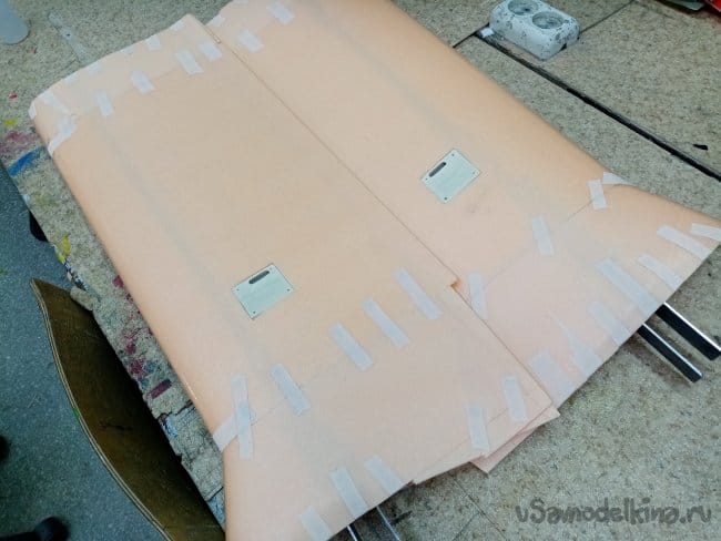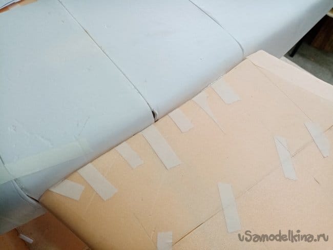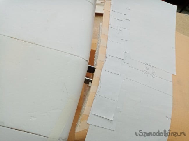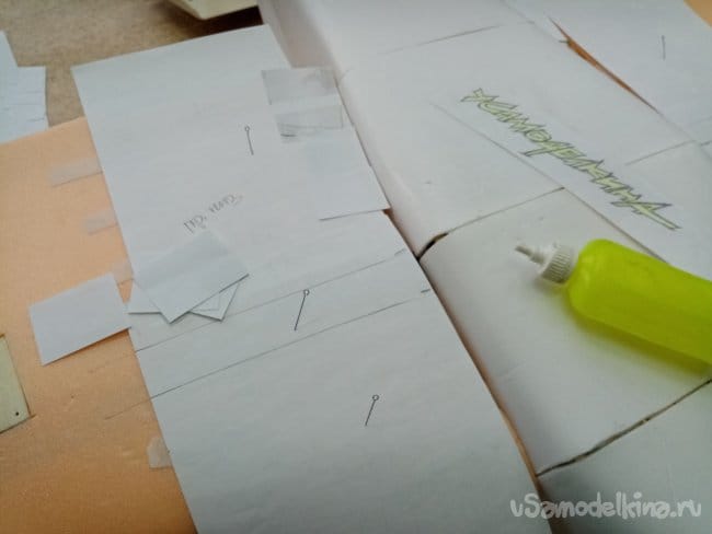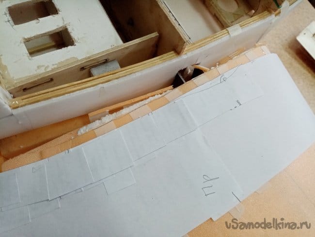 Начинаю приклеивать квадратики и прямоугольники повторяя контур фюзеляжа.