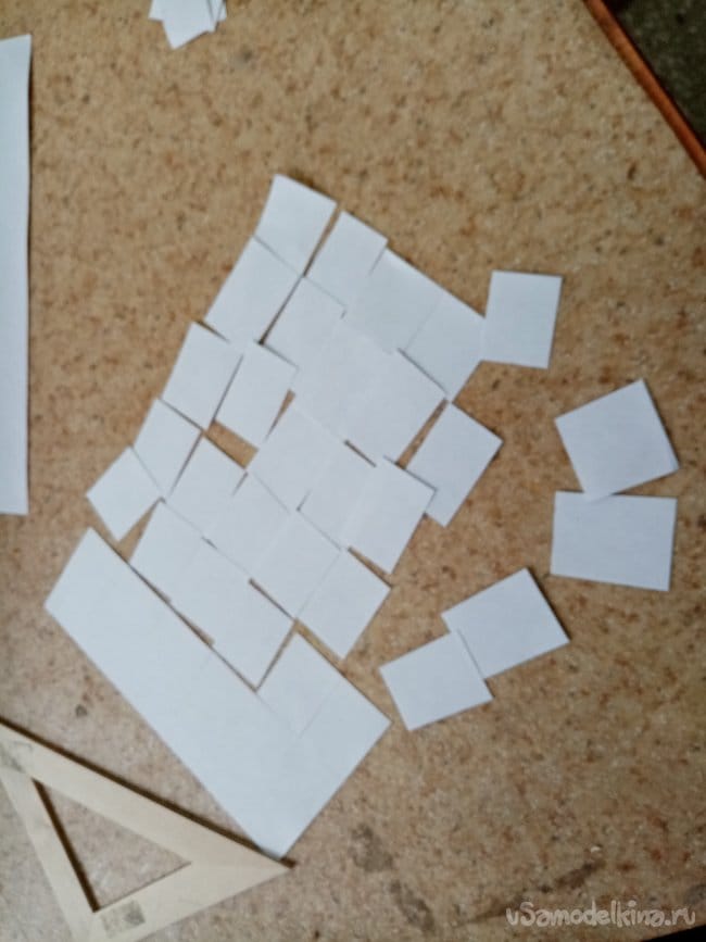 Переворачиваю тушку фюзеляжа и устанавливаю на стапеле тоже перевернутом. закрепляю крылья в непосредственной близости от сопрягаемой поверхности. Склеиваю из простой бумаги четыре полоски. А так-же нарезаю прямоугольников и квадратиков небольшой ширины.