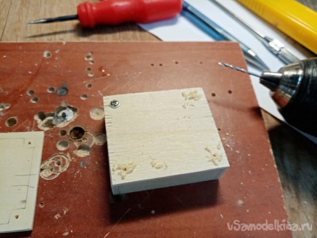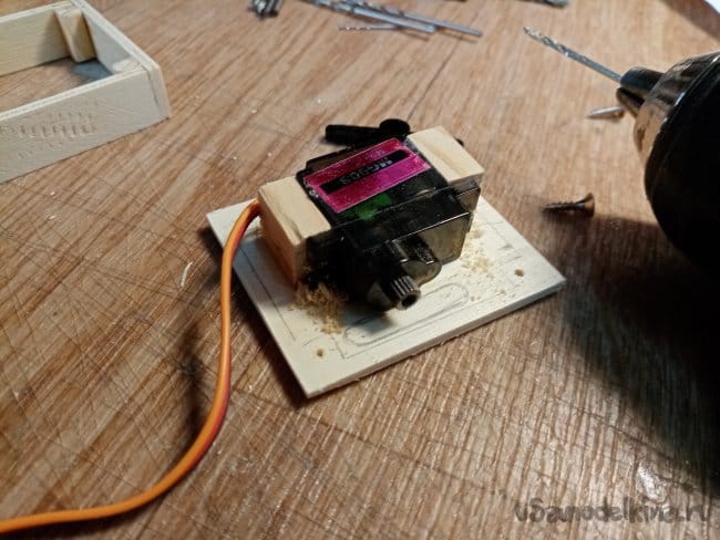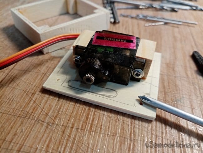 Размечаю и выпиливаю в размер крышку на эту коробочку, куда будет крепиться сам сервопривод. Немного шлифую утюжком со шкуркой.сверлю отверстия для болтиков крепления.