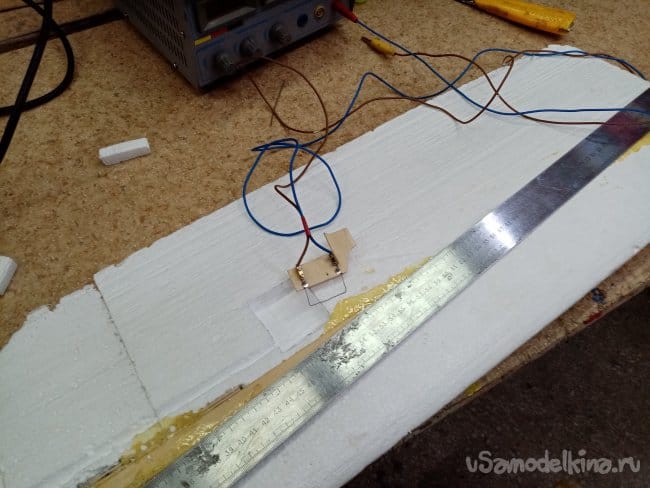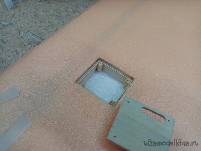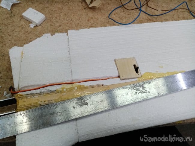 В крыле вырезаю квадратное отверстие нихромом немного меньшей глубины. С учетом обшивки из подложки под ламинат толщиной в 3мм. Так-же прорезаю канавки для проводов управления. Вклеиваю рамки.