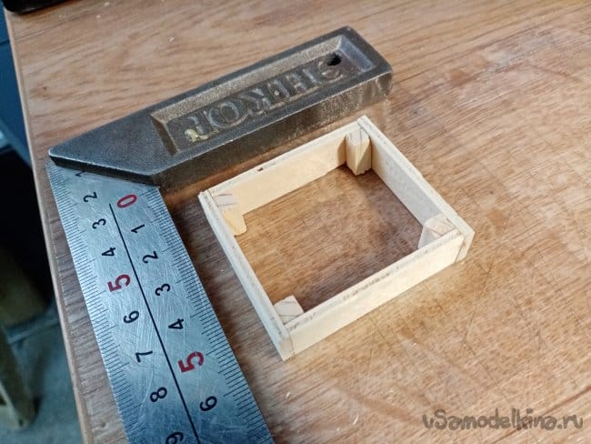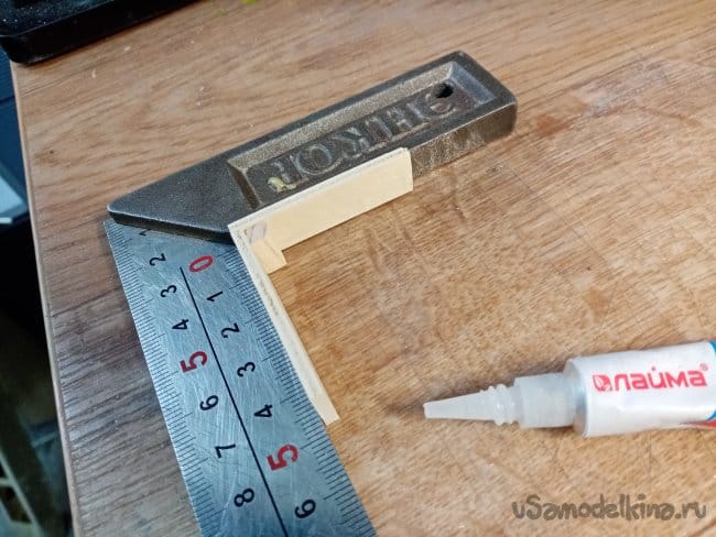 Вертикальность стенок контролирую при помощи угольника. Соединяю стенки, заклеиваю в угол столбик крепления.