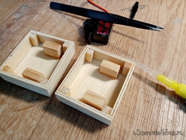 Начинаю собирать все в месте. Приклеиваю рейки в крышке, контролирую размерами сервопривода.