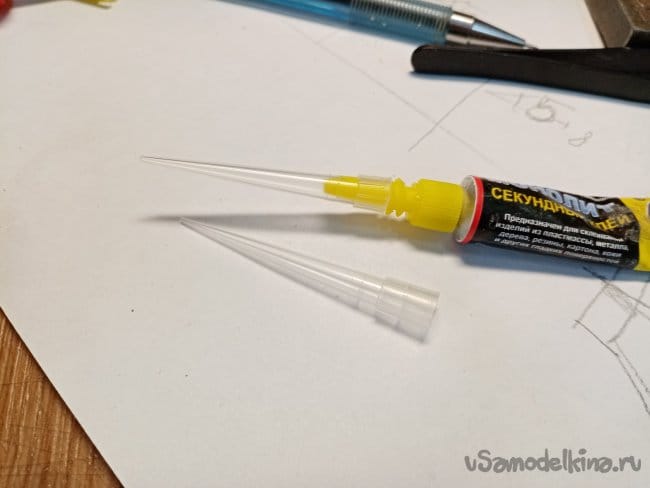 На кончик клея одеваю такую конусную трубочку. Её выпросил в медицинской лаборатории. Немного отрезаю широкую часть, она с натугой надевается на клей. Кончик трубочки отрезаю ножницами в нужный размер отверстия. Такой тонкой штукой очень удобно пролазить во все трудные места. Чтобы клей не застывал в маленькой трубочке, после процесса, переворачиваю тюбик вертикально и малость потрясу. Клей уходит из трубки.