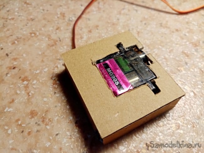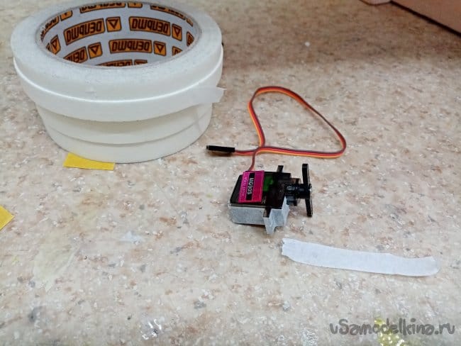 Размечаю в пенопласте куда устанавливать сервопривод, прорезаю отверстие. Саму машинку оборачиваю малярным скотчем, чтобы защитить от клея. Если нужно её извлечь, снимаю скотч и машинка чистая, даже красивая.