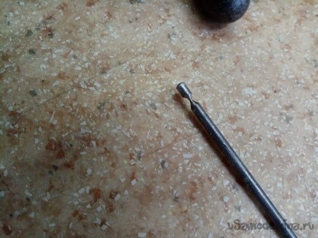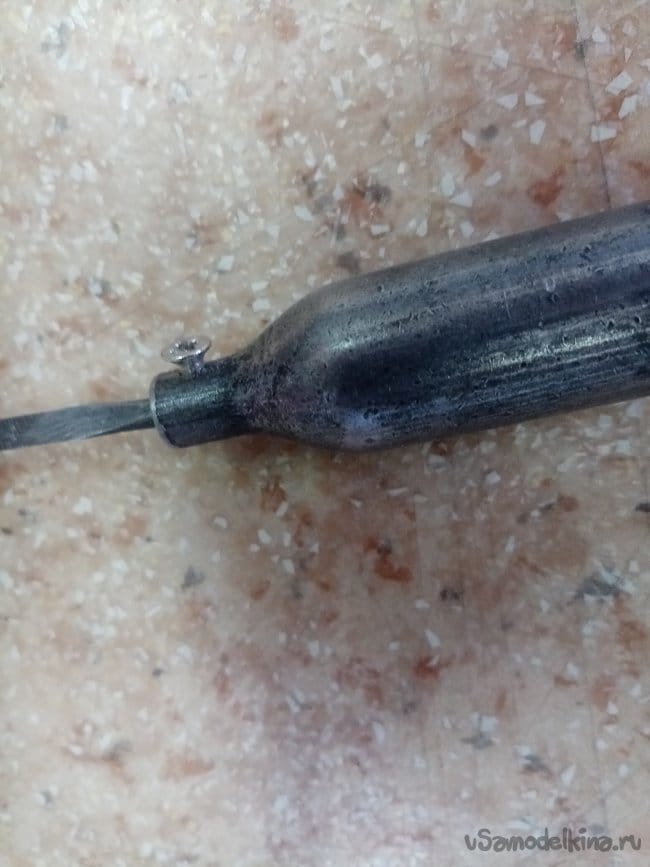 Сверлю отверстие на десятую меньше диаметра ручки надфиля. Сверло проходит баллон до дна, там немного врезается в стенку. Меряю длину ручки и малость стачиваю. Сламываю ненужное.