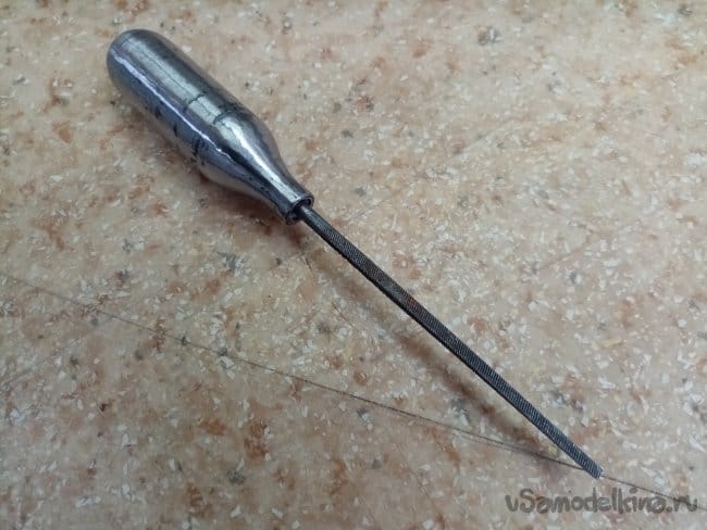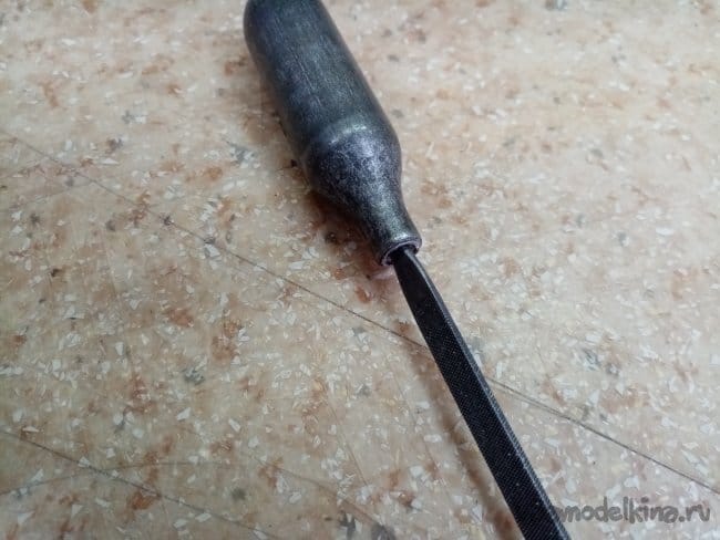 Получается двойная фиксация. Торец ручки врезается в дно заплечники надфиля в мягкий металл горлышка.