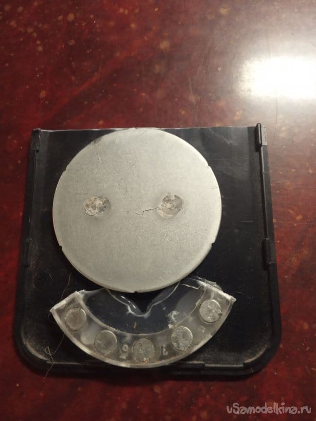 На кусок пластика подходящего размера термоклеем приклеил и подкову, и металлический диск. Чтобы не цеплять за это всё смартфоном, нашёл кусок упаковочного прозрачного пластика и вставил в карман.