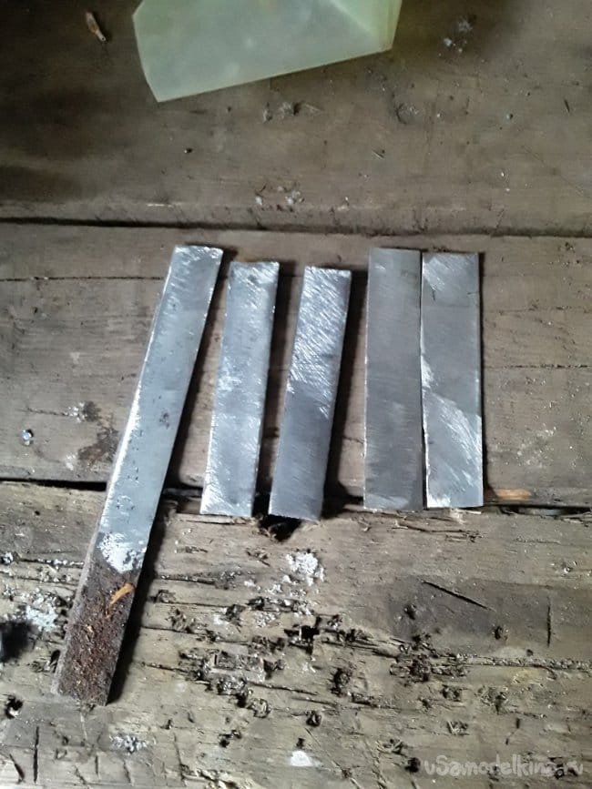 Всем здравствуйте сегодня хочу вам рассказать про свой удачный опыт кузнечной сварки. Часто в сети вижу красивые ножи дамасской стали и завидую мастерам умеющим такое создавать. Так как все советуют ковать дамаск кажется что все легко и доступно для всех, но в жизни все не так просто. Я не раз пробовал и не один десяток килограмм металла испортил так и не смог сковать ни одного ножа даже с 10 слоями. Очень жаль конечно буду пробовать еще много раз и надеюсь все получится. Основная проблема это температура в районе 1200°C немного не догреешь не свариться немного передержишь сгореть в общем без опыта ни как к сожалению мне не у кого учиться лишь в сети смотреть. Недавно решил попробовать отковать нож в народе под названием ламинат. Для ковки ламината берут три или пять пластин одинакового размера отшлифованные в блеск чтобы сопрягаемые поверхности были идеально плотно прилегали к другу друга иначе будет непровар и нож не получится. Для своего ламината взял 3 вида стали с разным содержанием углерода.