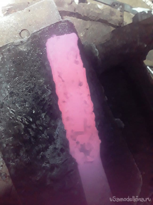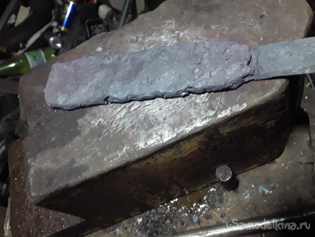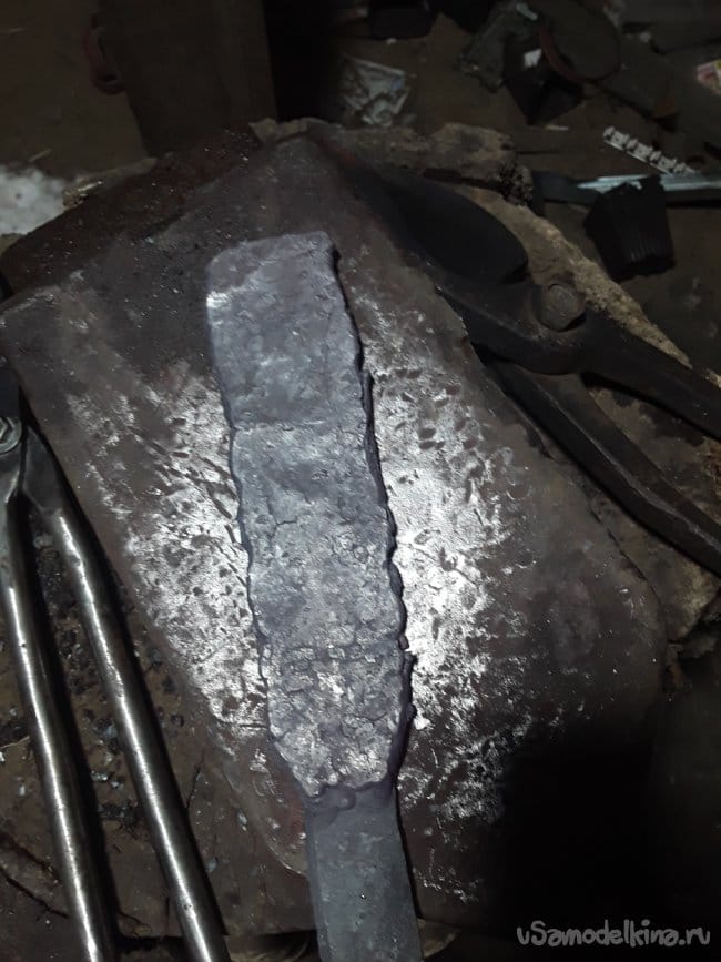 В центр пакета взял шх15 подшипник так как он хорошо режет и долго тупится на обкладки взял инструментальную сталь р6 мех пила и две пластины рессоры уже откованные. Перед сборкой пакета все тщательно шлифую на Гриндере затем зажимаю в тески, стягиваю все проволокой и перед сваркой окунаю в отработанное масло иначе при сварках между пластинами образуется окалина и металл не сварится. Обвариваю по бокам весь пакет по краям и один торец и даю остынуть немного на воздухе после полного остывания оставляю на некоторое время в масле после того как все пропиталось нагревать медленно пакет чтобы масло выпаривалось. После того как из торца перестал идти дым на пластинах образуется копать и она не даст образоваться окалина и металл сварится как нужно. Теперь завариваю торец и приступаю к ковке пакета. Особо ничего сложного нет нужно просто нагреть до нужной температуры и отковать в пластину. Нагреваю пакет до светло желтого цвета и отковал тяжелым молотом до толщены пластины 4 мм за один раз не стоит пытаться отковать пластину лучше нагревать чаще иначе при низкой температуре будет много непровара. Ну вот и все с ковкой закончил.