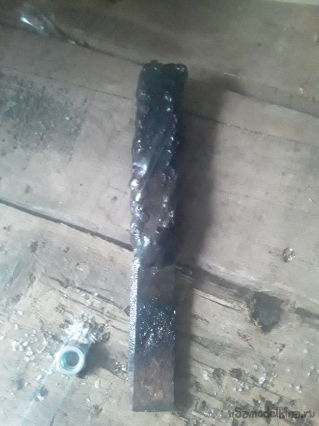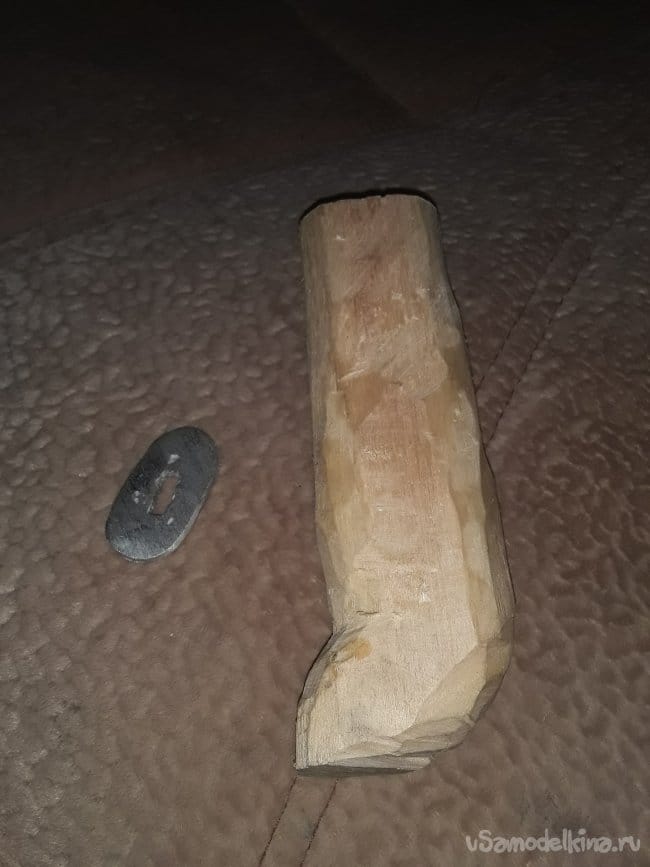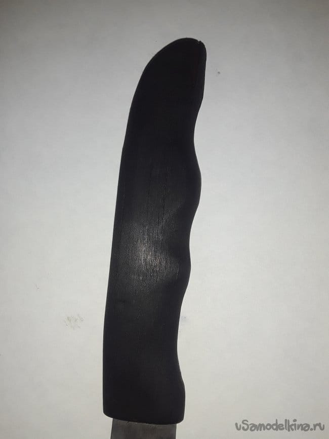 Для изготовления рукояти использую готовых сухой брусок березы так как хочу сделать тонированную огнем рукоять и брать для этих целей красивый кусок дерева не вижу смысла. Береза уже сухая сохла не один год из этой же партии делал рукоять и она мне очень понравилась очень крепкая. И так делаю разметку для отверстия под хвостовик и просверливаю нужного диаметра два отверстия. С начала хотел сделать и больстр, но потом передумал. Чтобы упростить себе работу острым ножом убираю все лишнее, что по силам, а остальное доработаю на Грин дере. Заливаю отверстие клеем, и забиваю клинья для надежной фиксации клинка в рукояти. После суток клей высох полностью и для защиты рукояти изнутри пропитываю льняным маслом в течении 2‐х часов. Для того чтобы получился красивый равномерный цвет дерева обжигаю газовой горелкой не вытирая масло с рукояти. После обжига шлифую тканью и воском ну вот и все рукоять готова.