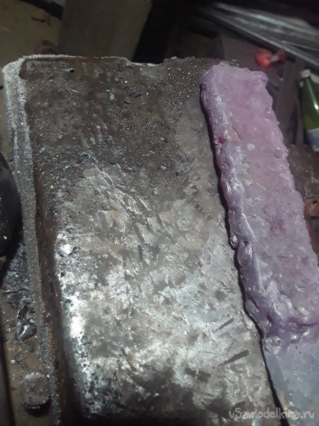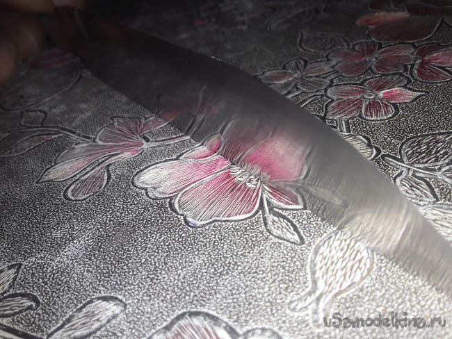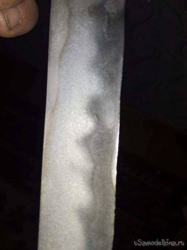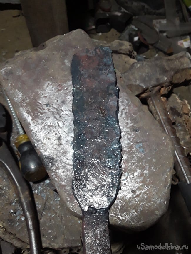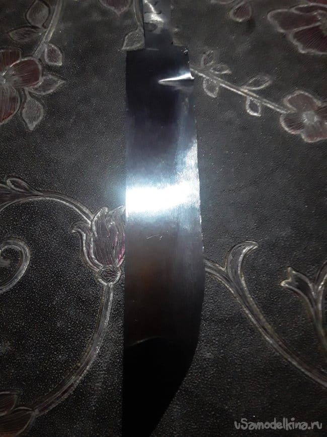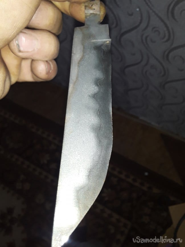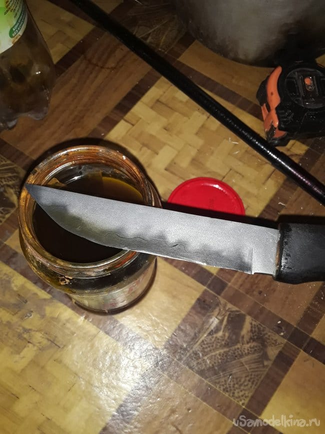 Протравку рисунка произвожу в уксусной кислоте разведённой 1 к 1 так как протравка в других доступных кислотах мне не нравится, а в уксусной кислоте травится очень долго, но результат на порядок лучше, чем при протравке в агрессивном растворе хлор железа. Клинок провел в растворе 3 дня раз в сутки смываю с содой окислы и продолжаю травить и так на третий день смыл, окис и решил долго не держать. Промываю все в теплой воде с содой и все готово рисунок проявился результатом доволен. Ну вот как-то так сегодняшняя статья про мою первую успешную кузнечную сварку только жаль что ламината, а не дамасской стали. Это не главное немного наберусь опыта и может когда-нибудь все, получится с ковкой дамасской стали. Ножом в общем доволен только считаю что ламинат только для красоты ведь режет все таки один слой это шх15. Ладно не судите строго как мог, так и сделал всем спасибо за потраченное время и до новых Самоделок друзья.