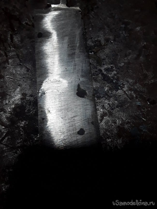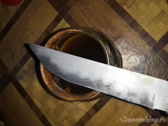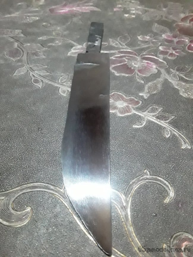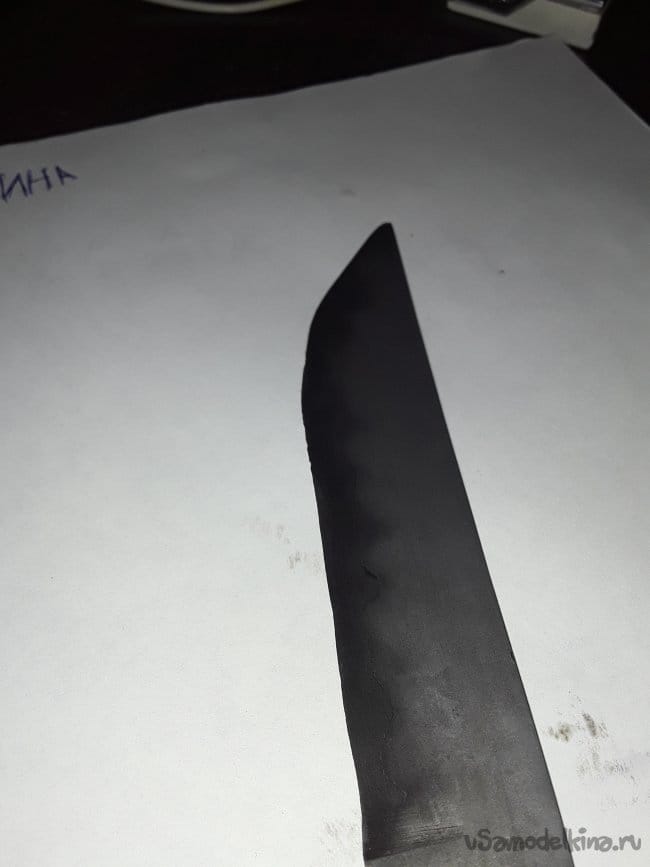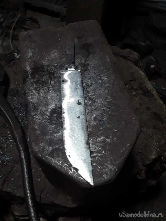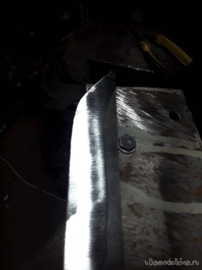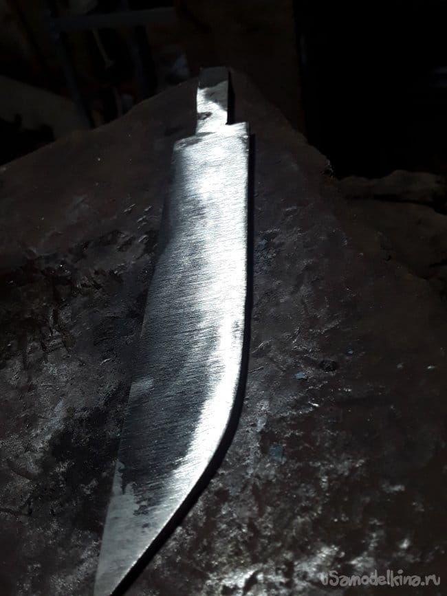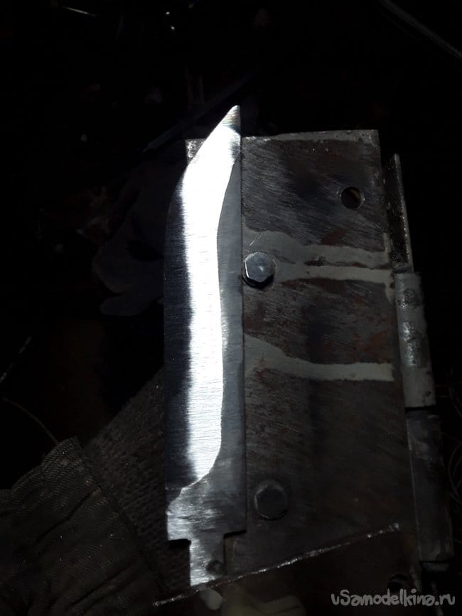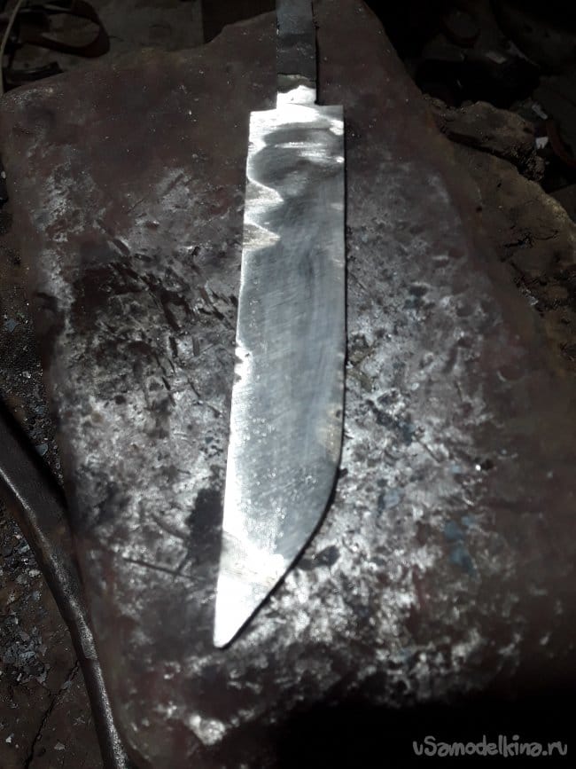 После ковки оставляю откованный пакет в горне остывать. Далее болгаркой отрезаю все лишнее по кроям и, для того чтобы решить что делать дальше травлю немного в кислоте и осматриваю на дефекты таковых не обнаружил. По шаблону рисую контур клинка и что могу отрезать болгаркой оставляя немного запаса самое главное не даю нагреваться клинку. После удаления лишнего довожу форму клинка на Грин дере, и шлифую плоскость ножа, убираю по ми немому иначе можно убрать нужный слой. После шлифовке плоскости толщена 3 мм вот и все делаю разметку и приступаю к формированию спусков. Для начала убираю немного и травлю немного и смотрю какой рисунок в общем можно дальше убирать лишний металл. После основных работ со спусками шлифую все в чистовую плавно меняя зерно бумаги и уже в конце довожу все вручную. Теперь приступаю к закалке клинка поискав в сети так и не нашел нужную информацию о температуре или о способе закалки. Решил производить закалку для шх15 потому что основные режущие свойства у шх15. Закаливаю в подсолнечном масле. Последняя процедура с клинком и самая важная это отпуск металла так как после закаливания клинок становится хрупким. Отпуск произвожу при температуре 180°C 1 час. Отпуск прошел, а клинок теперь черный предаю вид блеска клинку наждачной бумагой вот и все теперь осталось сделать рукоять и протравить клинок.