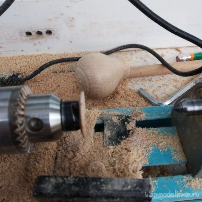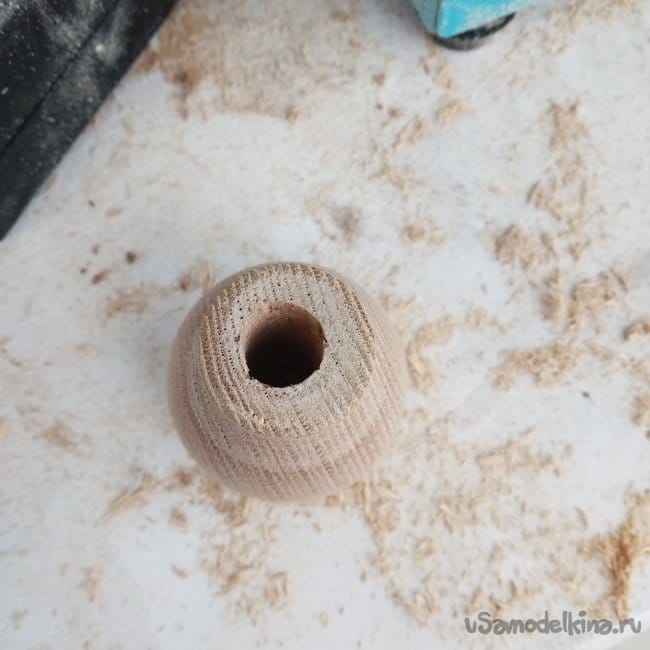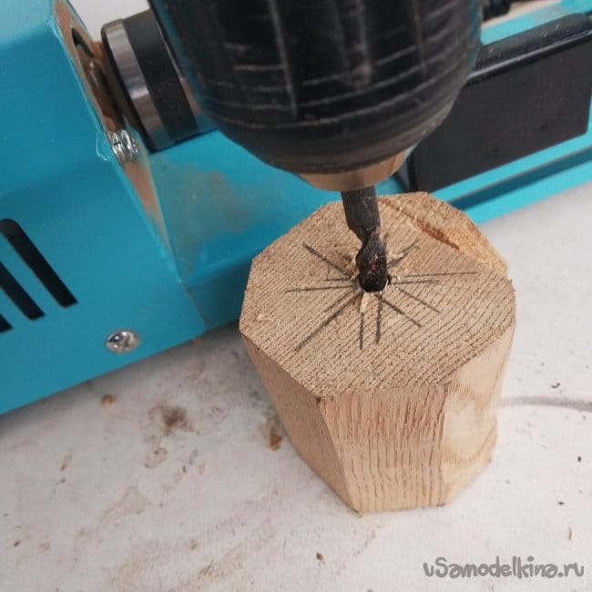 Так как нужно будет насаживать рукоятку на болт, я решил просверлить заготовку заранее, чтобы не было потом проблем со сверловкой готового изделия. Для начала я просверлил сверлом на 5мм, чтобы можно было прижать в него задний упор станка. Сверлил, предварительно разметив, разумеется.