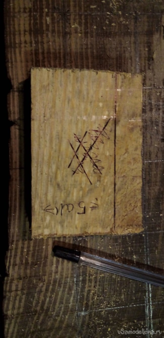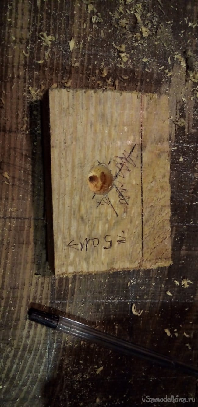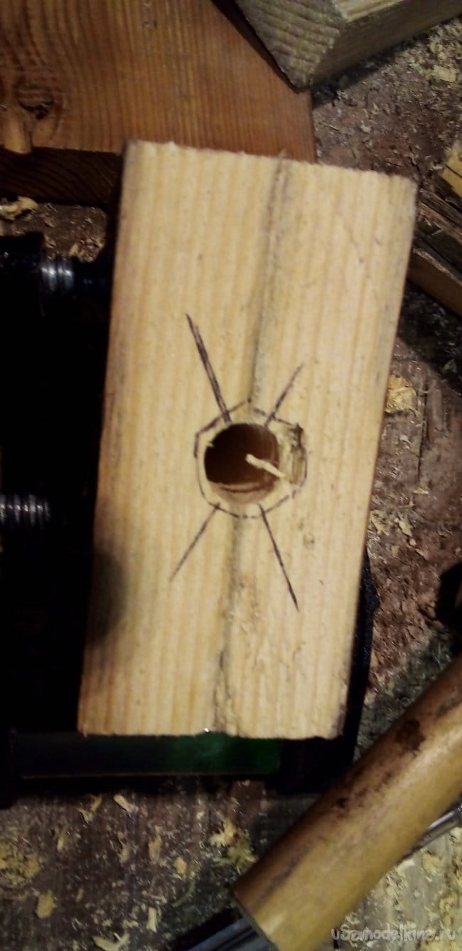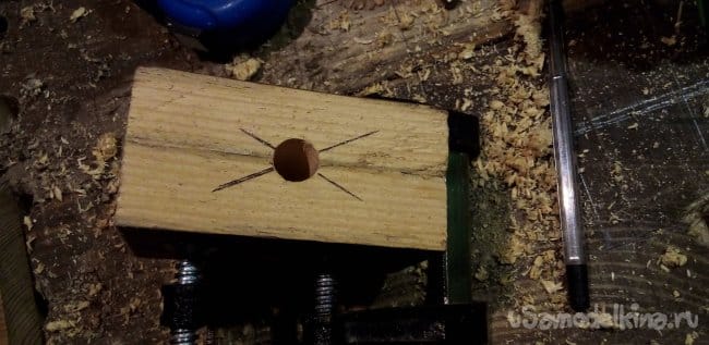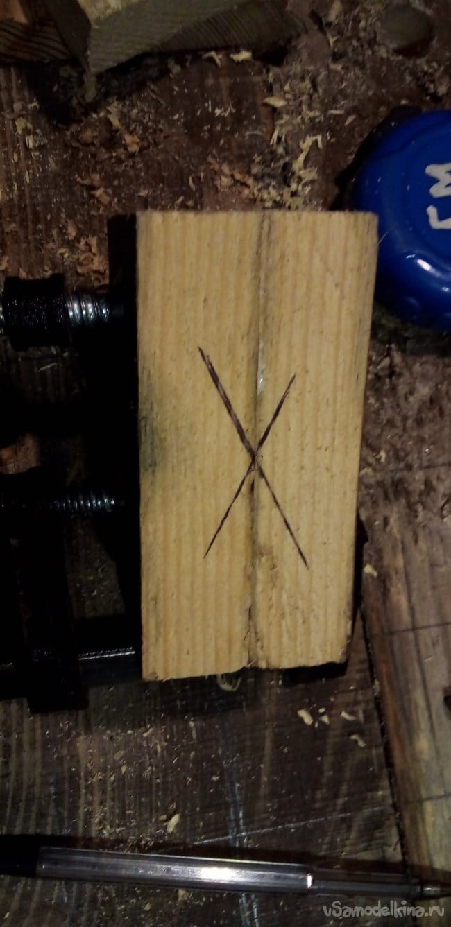 А пока ждём замеряем толщину получившегося брикета у меня получилось 5см. По этому берём третий брусок размечтаемся-отступаем от края толщину брикета и находим центр. И сверлим глухое отверстие, но его можно и не делать.