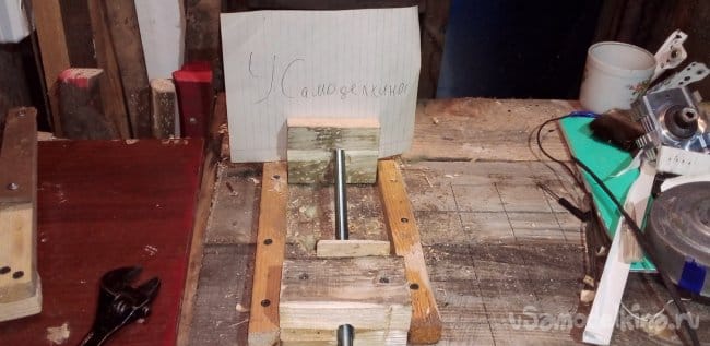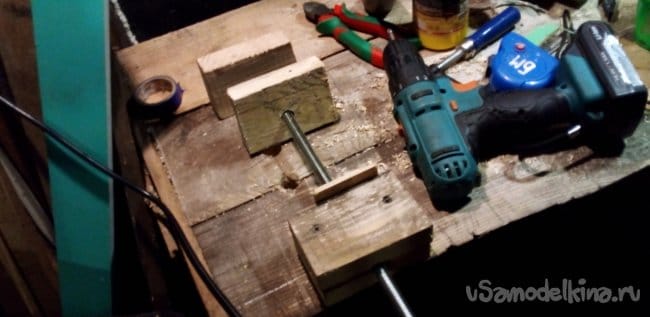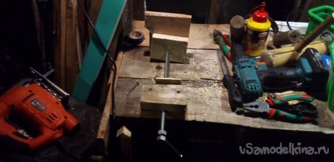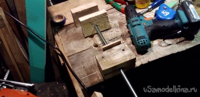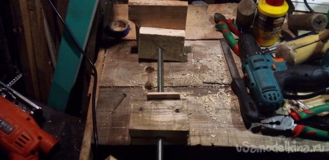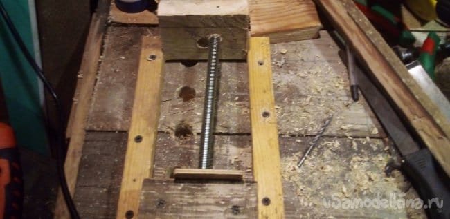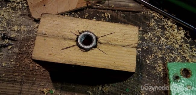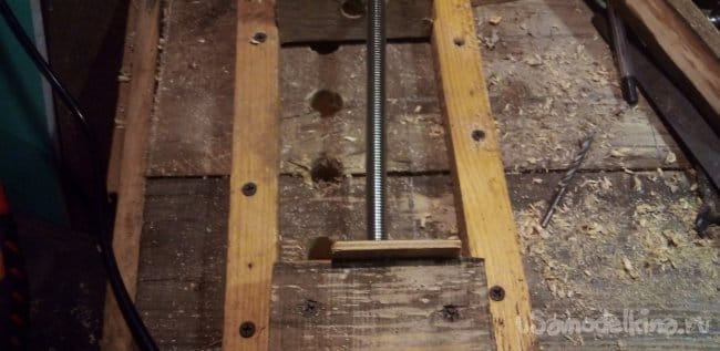 Теперь нужно впрессовать гайку и для верности я закрыл её тонкой фанерой с отверстием для шпильки.