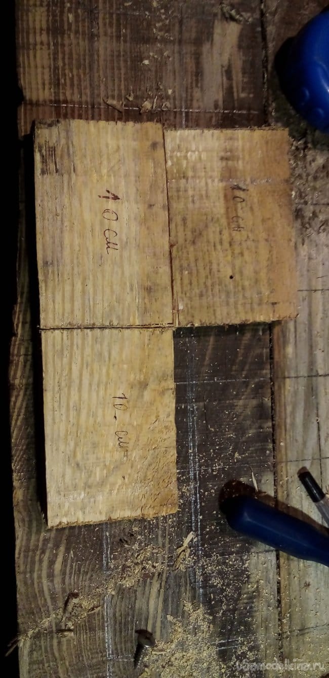 Берём брусок и нарезаем его на 4 части по 10см два из них склеиваем на ПВА и ждёмс