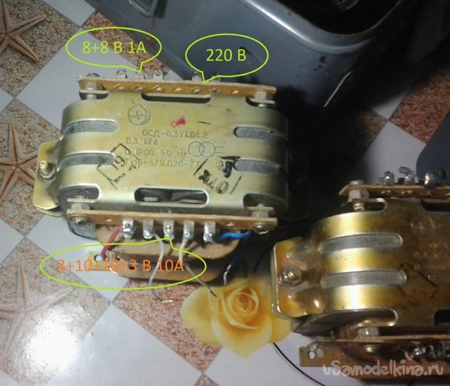 Кстати, о трансформаторах, 2 штуки. Марка ОСД-0,3УХЛ4.2, от «слайдера» (проектора), 0,3 кВА, работали на галогенку 24*250 Вт плюс механика. Можно было применить и более мощные, но у них больше собственное потребление, токи ХХ - холостого хода.