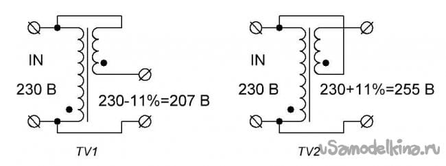 Естественно, эти схемы можно использовать и так: в последней, подав на вход повышенное напряжение около 260 В, на выходе получим близкое к 230 В, т.е. номиналу. Для расширения диапазона регулировки до ±20% используем два трансформатора 220/24 В, причем первички соединяем параллельно, а вторички последовательно.