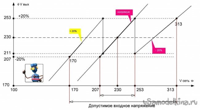 Какие же возможности у получившейся схемы, составляем график. По вертикали – выходное напряжение, номинал 230 В и допустимое отклонение ±20% и ±10%.