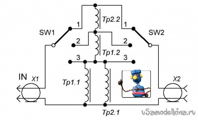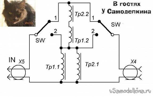 При соответствующем подключении (начало к началу или начало к концу) вторичной обмотки, напряжение на которой составляет 11% от напряжения на первичной (трансформатор 220/24 В), получаем на выходе регулировку ±10% от входного. Вот еще варианты включения.