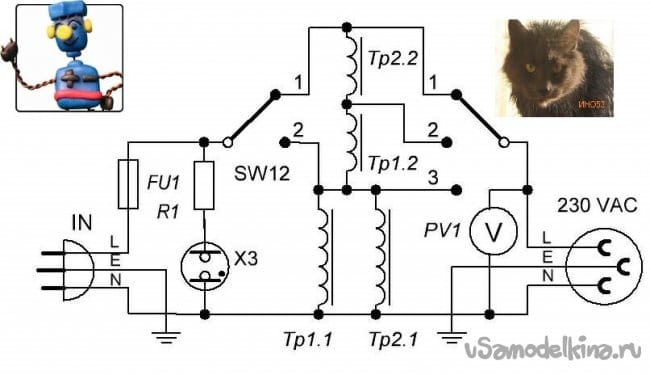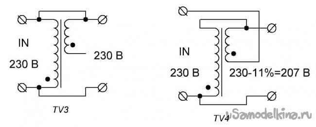 Перерывы в подаче электроэнергии прекратились (почти), но качество ее никуда не годится. Анцапфер на трансформаторе ТП стоит, видимо, в положении максимального выходного напряжения, поэтому при минимуме потребления, ночью и днем, напряжение в сети доходит чуть не до 300 вольт, зато вечером, при пике нагрузок, падает чуть ли не до 170В. Если импульсные блоки питания это кое-как переносят, то бедный холодильник ночью натурально ползает по кухне. И к тому же ему только синусоиду подавай… Заказчик, тот самый НВ из указанной публикации, предложил помочь ему попробовать исправить положение путем использования трансформаторов, включенных по автотрансформаторной схеме. Вот примеры таких схем.