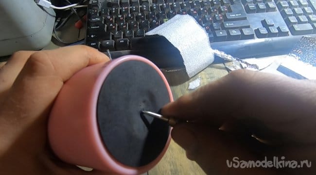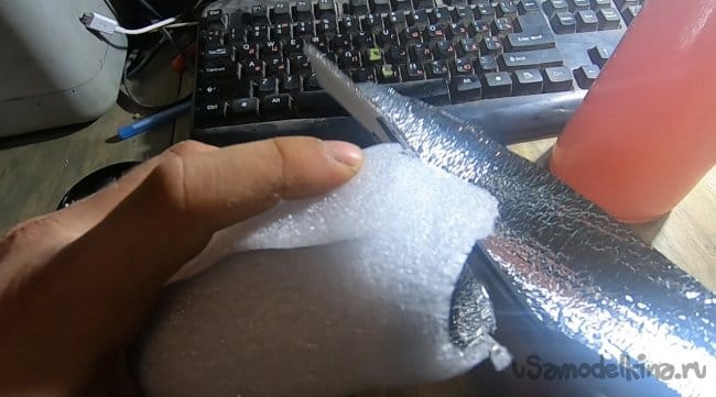 Чтобы содержимое не остывало быстро в мороз на улице или в машине, решил кружку немного утеплить. Утеплитель там влазит не под самый верх, но все равно этого достаточно, чтобы удерживать теплоту на много дольше. Утеплитель использовал толщиной 3 мм.