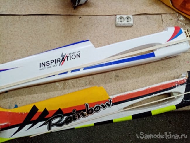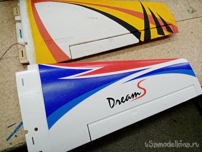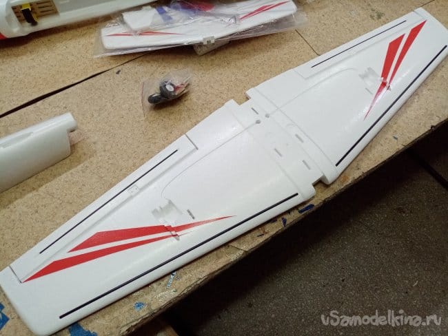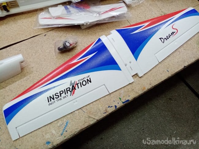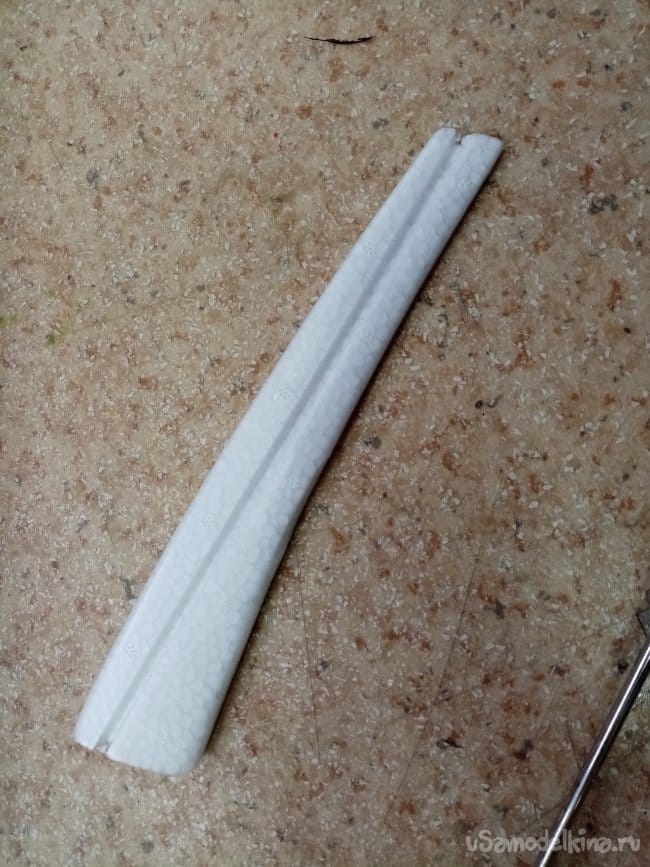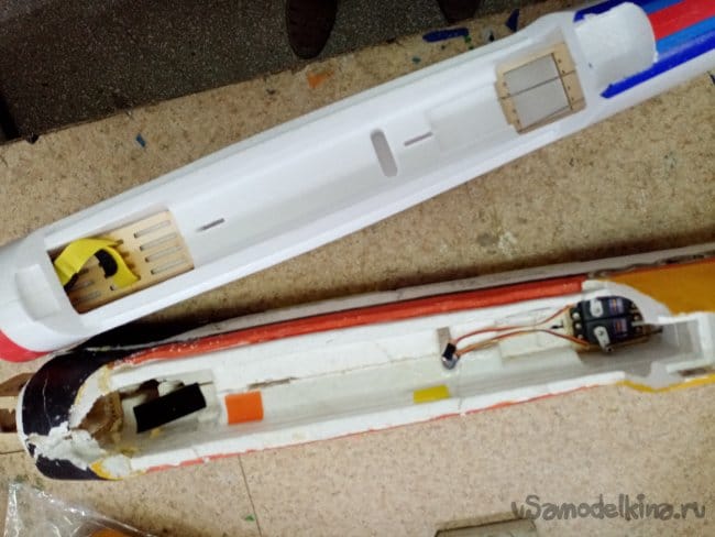 Соединение как на оригинале на клинышках и трубке. Подходит хорошо. Приложена карбоновая трубка с толстыми стенками. Но вот незадача, хлябает в квадратном пенале. Внутренний диаметр пенала 9 мм, трубка диаметром в 7 мм. Буду изобретать, трубку карбоновую в 9 мм или алюминиевую. Посмотрю по месту. Элероны навешаны на тонкие пенопластовые пластинки отлитые заодно с крылом. Переделаю на пластиковые петли.